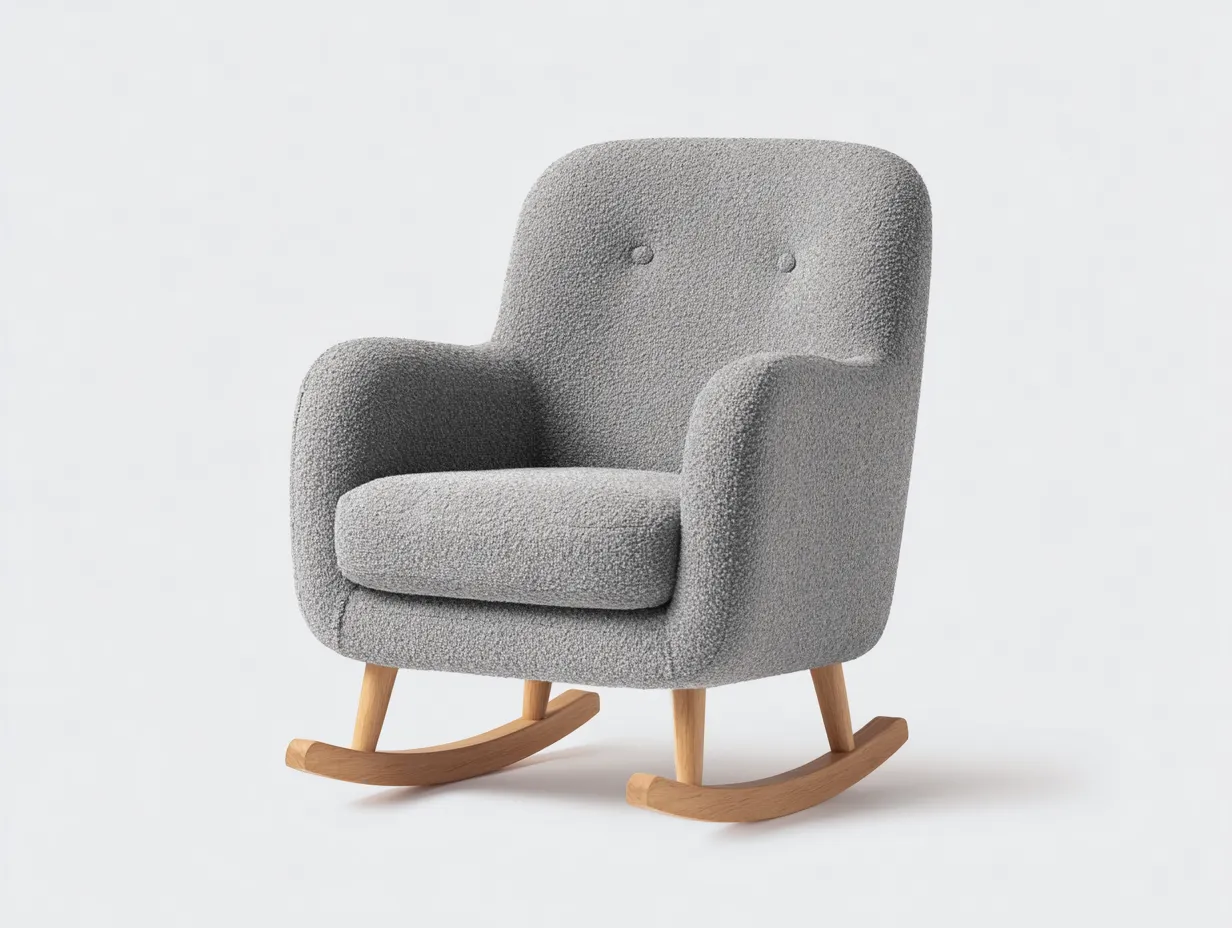 Tapizado en tejido bouclé de color gris claro, con estructura interior resistente y base de madera maciza natural con patines curvados que permiten un balanceo estable y fluido.